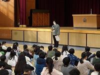 12月15日(月)。陸上男子100m日本記録保持者である山縣亮太さん(セイコーグループ)のご厚意により、来校していただけました。3・4時間目は、2年生に速く走るためにをテーマにした実技指導、5時間目は全校児童が体育館に集まり、インタビュー形式の講演をしていただきました。「昨日の自分より、今日の自分。一歩ずつ進んでいく」という言葉が、子どもたち、教職員の心に残りました。お忙しい中、本当にありがとうございました。今後のご活躍を祈念しています。