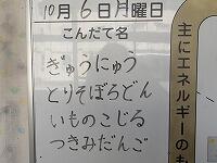今日はお月見献立として、とりそぼろ丼に芋の子汁、そして季節感のある月見団子が添えられた給食でした。とりそぼろ丼は甘辛の味つけがご飯によく合っていました。また、芋の子汁は里いものほくほくとした食感とだしのうま味が広がり、温まりました。そして、月見団子は、秋の行事を感じさせる一品で、子どもたちも「おいしい」と言いながら、楽しく味わっていました。