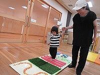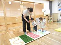 スポンジや芝の上を歩いて足の裏で感触を楽しんだりトンネルくぐりをしたりしました。