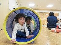 0歳児さんのふれあい保育はトンネルくぐりや手作り輪投げや玩具で遊びました。