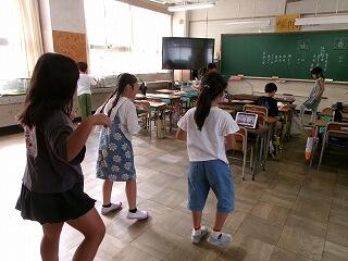 昼休みにリレー練習をする様子と、教室の後方でタブレットを使ってダンスを楽しむ様子を紹介します。