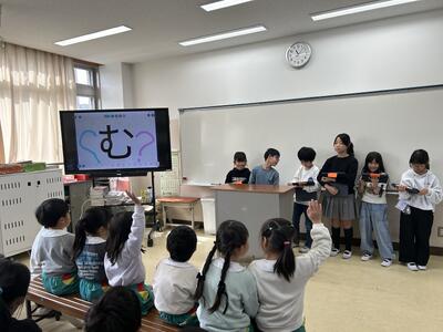 その後の活動では、グループごとに準備していた発表や遊びを楽しみました。リコーダーの演奏、けん玉やお手玉の紹介、紙しばい、簡単なゲーム遊び、クイズ、〇×ゲームなど、園児が体験できる内容を工夫して伝えました。3年生は園児の様子をよく見ながら、「ゆっくりやってみてね」「ここはこうするとできるよ」と優しく声をかけ、上級生らしい頼もしい姿が見られました。