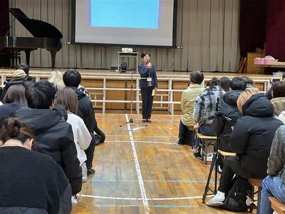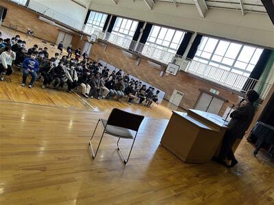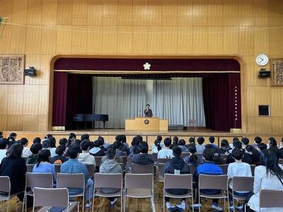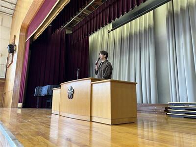 「人と違うことをする勇気が大事」と語り、大きな挨拶をする小さな目標を持つといった、すぐに実行できる行動を例に挙げてくれました。児童からは「明日から、朝いちばんに大きな声であいさつする!」と前向きな声も聞かれました。