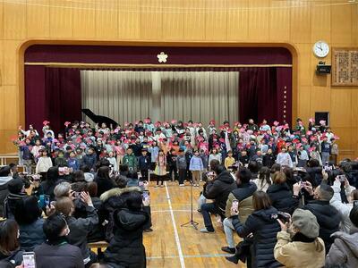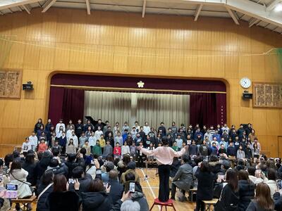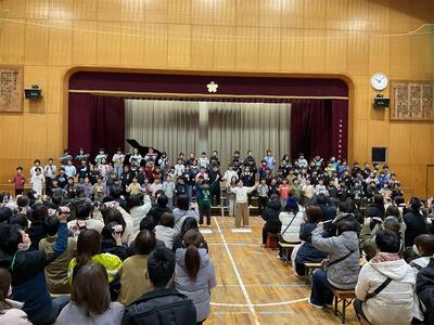 6年生からの発表では、在校生への感謝とこれまでの思い出が語られ、会場からは自然と温かい拍手がわき起こりました。その後、全校児童で「ありがとうの花」を合唱し、体育館いっぱいに優しい歌声が響きました。