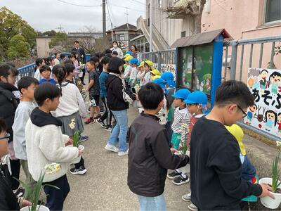 そして4年生が、咲きそろったスイセンを近くの幼稚園へ贈呈しに行きました。幼稚園の子どもたちは「わあ、いいにおい!」「きれいだね!」と笑顔いっぱい。