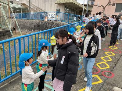 2月24日(月)の中間休みから3時間目にかけて、田辺幼稚園の年長児が来校し、3年生の児童と交流活動を行いました。今回の交流は、幼稚園と小学校のつながりを深めるとともに、3年生が年長児とかかわる中で成長を感じられる時間となることを目的に実施しました。