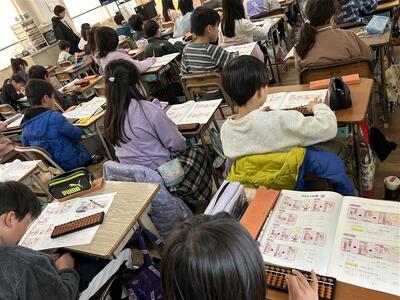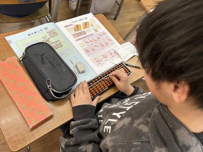 3月2日(月)、3年生(1〜3組)では、2〜4時間目にかけてそろばん教室を行いました。全国珠算教育団体連合会から講師の先生をお招きし、各教室でそろばんの基礎から計算方法まで、じっくりと学習しました。