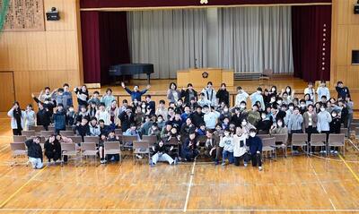 最後は学年みんなと記念撮影をしました。カメラに向かってポーズを決める児童に、大倉さんが「いいね!もう1枚いこか!」と声をかけ、体育館はとても和やかな雰囲気になりました。