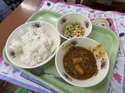この日のメニューは、子どもたちに人気の「わくわくビーフカレー」、ごはん、まめまめサラダ、そして牛乳。