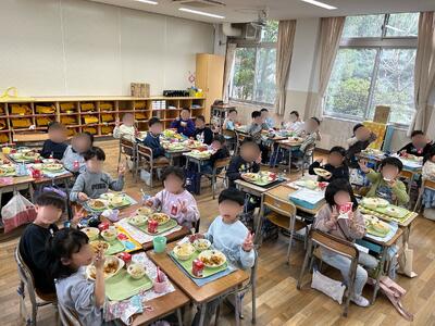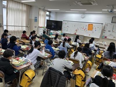 田辺小学校の各教室では、1年間お世話になった給食への感謝の気持ちを胸に、子どもたちが笑顔で食卓を囲む姿が見られました。