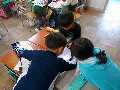 1年生は、音楽科「がっきとなかよくなろう」の授業で、音のつなげ方を工夫して、音楽づくりをしました。国語科「くじらぐも」で学習した「くじらぐもが来るとき」「くじらぐもが帰って行く」のそれぞれの場面を想像して、3人グループで音楽づくりをしました。タブレット端末を活用して、場面のイメージに合った打楽器を選び、音の強弱や速さなどの鳴らし方も工夫していました。最後の発表会では、つくった音楽を実際に自分たちが楽器で演奏して発表しました。それぞれのグループの友達を聴き合い、音楽づくりの工夫を楽しんでいました。