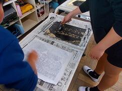 6年生は、図画工作科の授業で、寺や神社をテーマに制作した版画の印刷に取り組んでいます。立体感を表現するために、光と影の部分をどのように彫るか、また、どの部分をどの程度残すかを考えながら制作してきました。試し刷りを行っては自分のイメージどおりに仕上がっているかを確かめ、イメージに近づけるために彫りを再調整する姿が見られました。どのような作品に仕上がるのか完成が楽しみです。