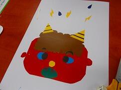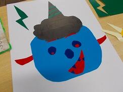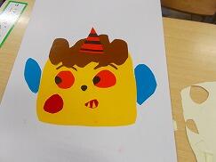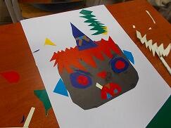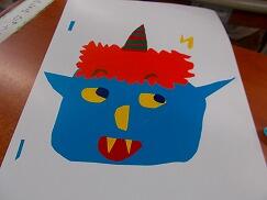 1年生は、図画工作科の授業で紙版画の制作に取り組んでいます。まず顔の形を決め、目の形や黒目の向き、眉毛や牙の大きさや形、角の大きさや本数などを工夫しながら、想像を膨らませて切ったり貼ったりし、自分の好きなおにを表現していました。