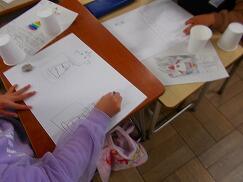2年生は、生活科の授業で紙コップロケットを制作しています。紙コップに輪ゴムを十字にはめ込み、そのはじく力を利用して飛ばす仕組みです。子どもたちは、まずどんなロケットにするのか設計図を描き、そのイメージをもとに紙コップへ絵を描いたり色を塗ったりして、自分だけのロケットを作っています。どうすればより遠くまで飛ぶのかを考えながら工夫を重ね、試行錯誤する中で、ものづくりの楽しさを味わっていました。