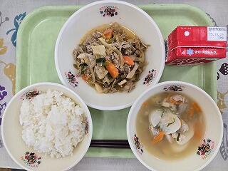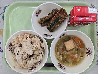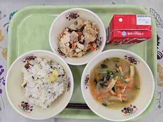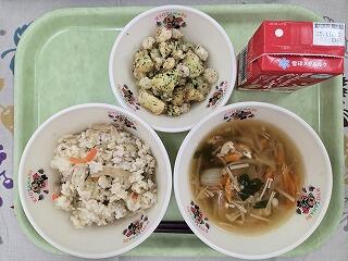 給食では、『ほしじいたけ ほしばあたけ』という本にちなんだ献立として、「ほだぎの里ごはん」を食べました!