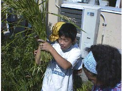 薪小学校の中庭の池の側に田んぼを作りました。 5年生が田植えをし、毎日世話をしました。 秋には少しだけれど稲穂が実りみんなでこのお米を使って新たに学習をはじめました。