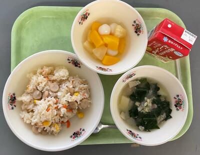 今日の給食時間では、主菜の『鶏肉のから揚げ』ができるまでの調理工程を動画で紹介しました。家庭とは異なる大きな釜や、大量の食材を一度に扱う網などの調理器具に、子どもたちは興味津々な様子で見入っていました。調理員さんの手際の良さや、給食室の設備について学びながら、感謝の気持ちを持って美味しく味わうことができました。