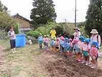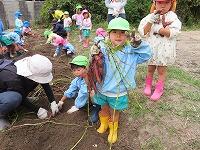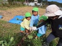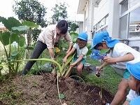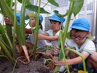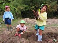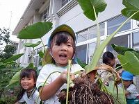 裏の畑で育てていたサトイモが収穫の時期を迎え、年長児が掘りました。