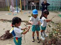 先日芋掘りをし、芋のツルを幼稚園に持って帰ってきました。そのツルを丸く編んでリースを作ったり、輪投げにしたりしました。最初はうまく編めなかったのですが、コツをつかみ、きれいな輪ができました。