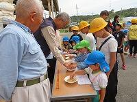 少しずつですが、年長児は育てた米も持ち帰りました。米袋も自分たちで書いて、今日持ち帰りました。