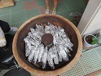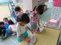 先日収穫したサツマイモで焼き芋パーティーをしました。朝から楽しみに登園してきた子ども達…みんなできれいに洗って、アルミホイルで巻いて準備しました。