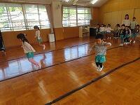 ウォーミングアップで体をほぐした後は、軽快なリズムに乗ってラインをリズミカルに跳びました。