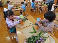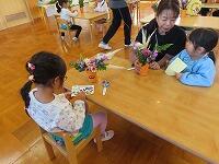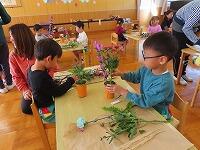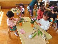 花器にシールを貼ってかわいく仕上げました。みんな同じ花なのに、個性が出て素敵な作品ができました。花と真剣に向き合う姿が見られ「たのしかった!」「見てみて!きれいやろ?」と自信作を見せてくれました。