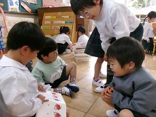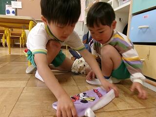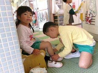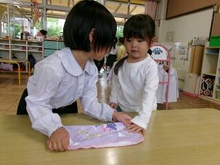 長いGWのお休みも終わり、ちょっぴり緊張もほぐれたものの、時々お母さんを思い出し寂しい気持ちになっている3歳児さんたちを元気づけようと、5歳児きりん組さんたちがお手伝いにやってきました。