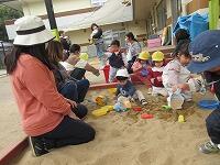 ふれあい保育(0歳児・1歳児)がありました。砂でごちそうやお山を作って楽しく遊びました。