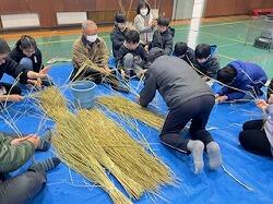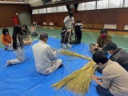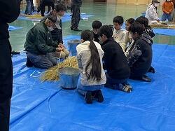 米作りを学んできた5年生は、地元の方々(卒業生の皆様)に丁寧に教えていただきながら、しめ縄づくりを体験しています。