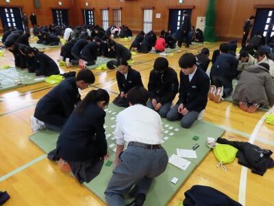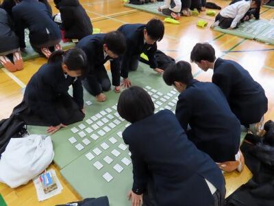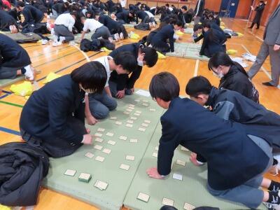 今年も新春百人一首大会を開催しました。非常に寒い1日でしたが、WBCカップをかけた熱い戦いとなりました。どのグループも全力で取り組み、校長先生や養護の先生などたくさんのゲストにも来ていただき、大盛り上がりとなった1時間でした。