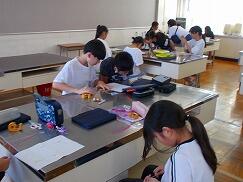 6年生は、家庭科の授業で「お弁当袋」を作っています。お弁当袋には、自分の好きな刺繍をしています。ミシンでまっすぐに縫えるように頑張っています。
