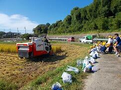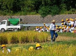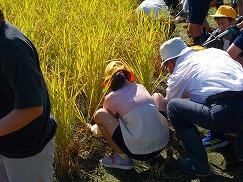 10月8日(水)、京田辺市青少年育成会の皆様にお世話になり、田植えに引き続き、稲刈りの体験をさせていただきました。米作りの学習をした5年生、実際に体験することで、さらに多くの気づきがあったようです。注意事項を聞き、鎌で稲を刈りました。最初は慎重に、慣れてくると手際よく刈り、「楽しい!」という声が上がっていました。また、コンバインで稲を刈る様子も見学させていただき、稲を刈るスピードに驚いていました。
