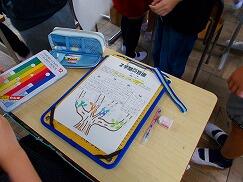2年生は、初めて絵の具を使うので、とてもわくわくしている様子でした。まずは、パレッドや筆洗の使い方を学習しました。自分が塗りたい色をどのようにして作るのか、他の色と混じらないようするにはどうしたらよいかなど、しっかりと先生の話を聞いて学んでいました。自分の好きな色を自由自在に作れるようになるといいですね。